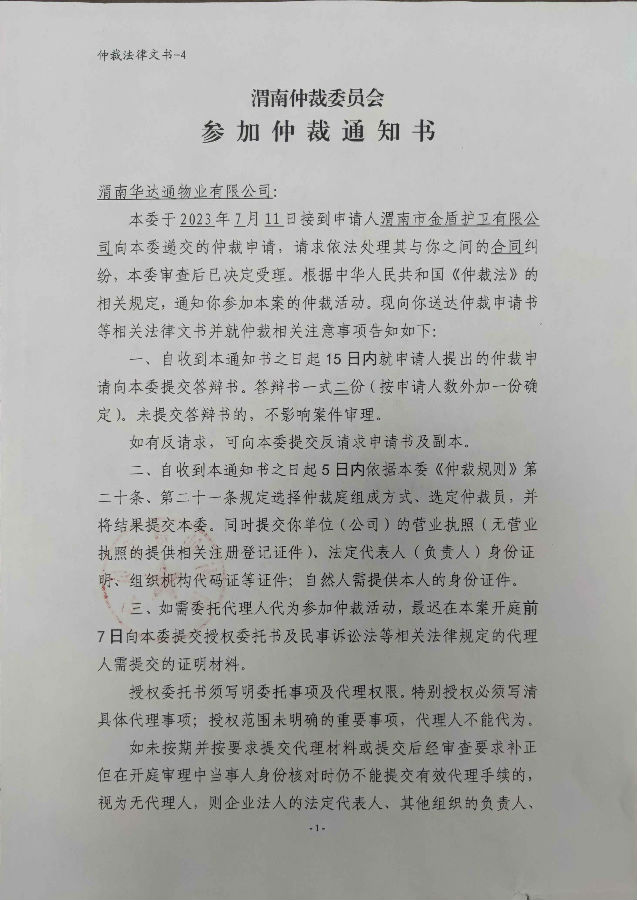 渭南市金盾護(hù)衛(wèi)有限公司與渭南華達(dá)通物業(yè)有限公司合同糾紛案公告