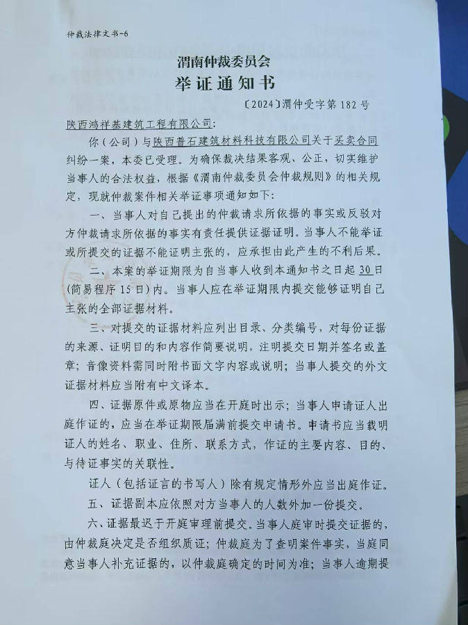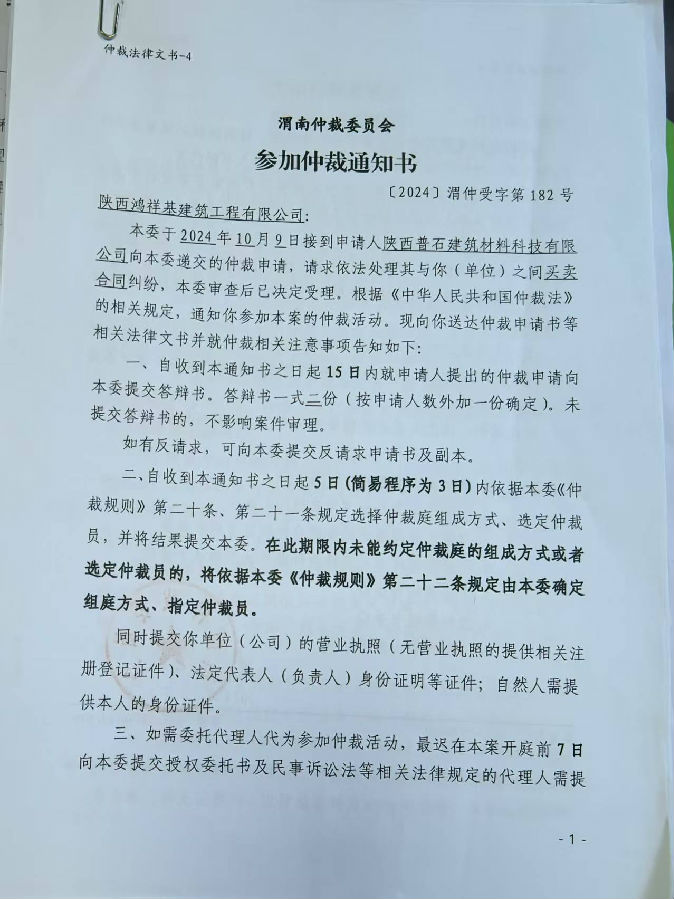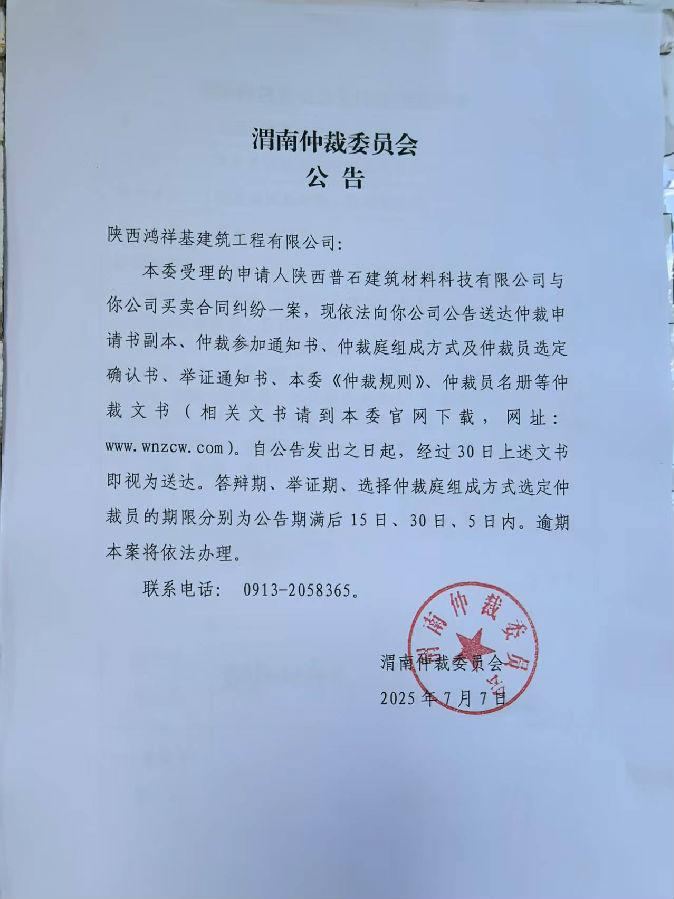 陜西普石建筑材料科技有限公司與陜西鴻祥基建筑工程有限公司買(mǎi)賣(mài)合同糾紛案公告
